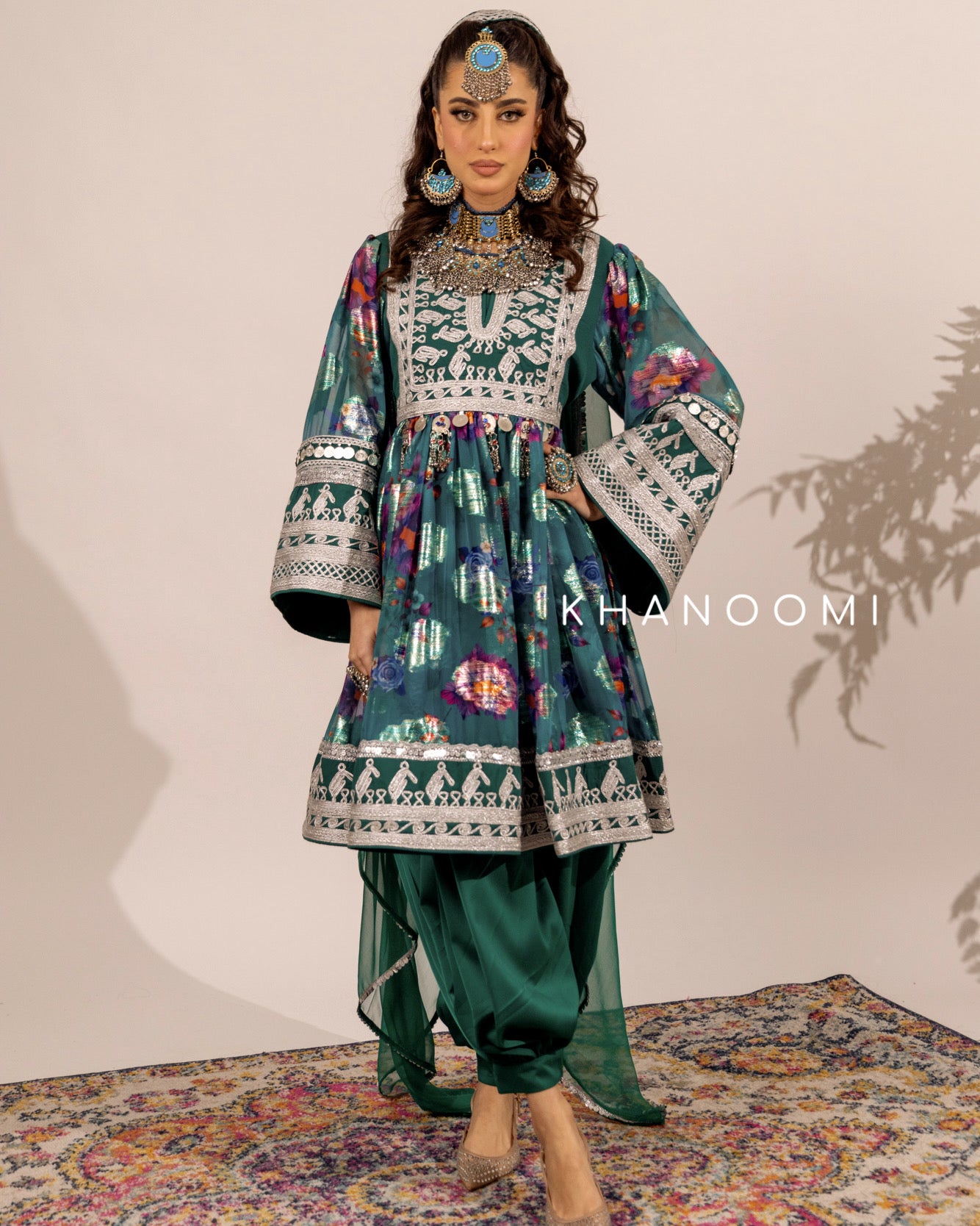 Emerald three-piece set featuring silver embroidery (cherma) and a flowing printed skirt. Designed with a back zip and adjustable belt for a refined fit.