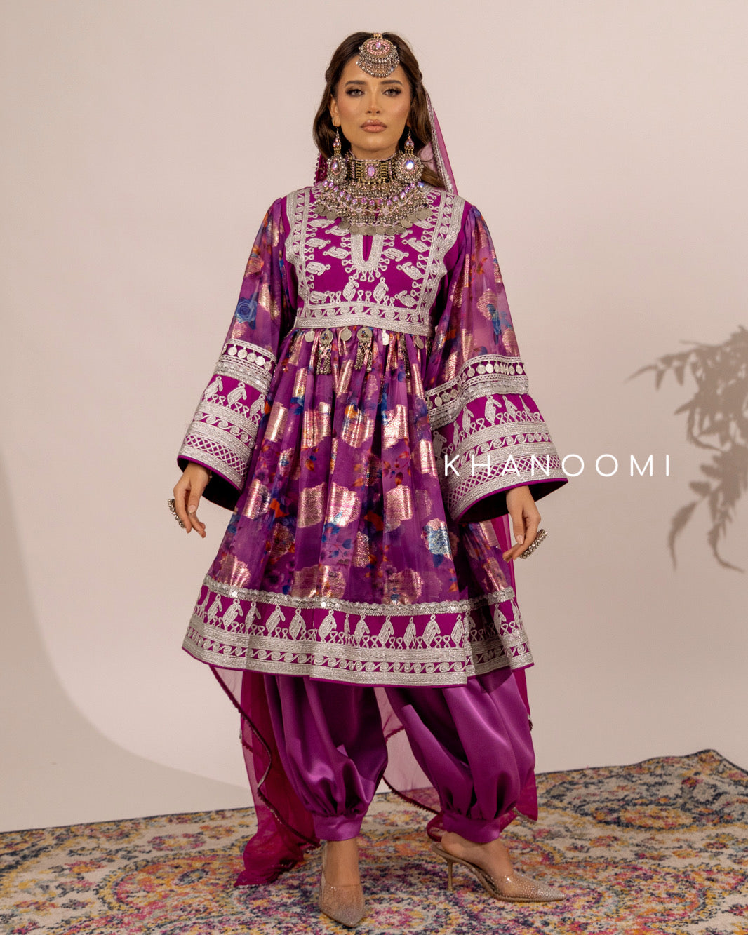 Rich Pink three-piece set featuring silver embroidery (cherma) and a flowing printed skirt. Designed with a back zip and adjustable belt for a refined fit.