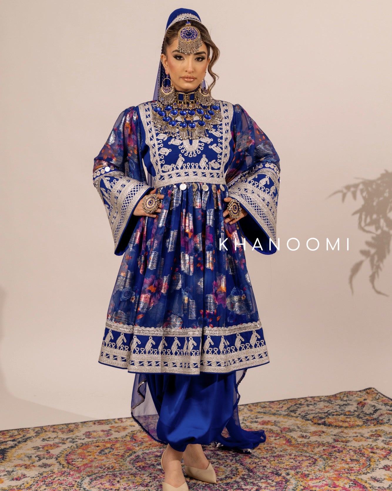 Royal blue three-piece set featuring silver embroidery (Cherma) and a flowing printed skirt. Designed with a back zip and adjustable belt for a refined fit.