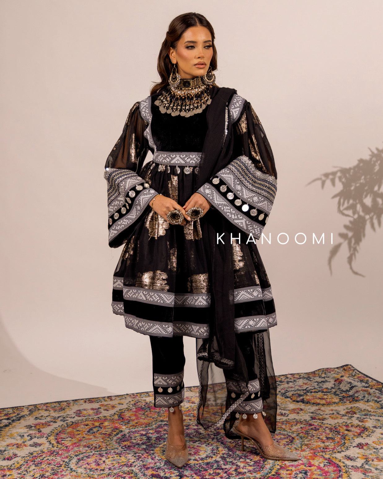 Deep black three-piece set featuring intricate silver detailing and a flowing printed skirt. Designed with a back zip and adjustable belt for a refined fit.