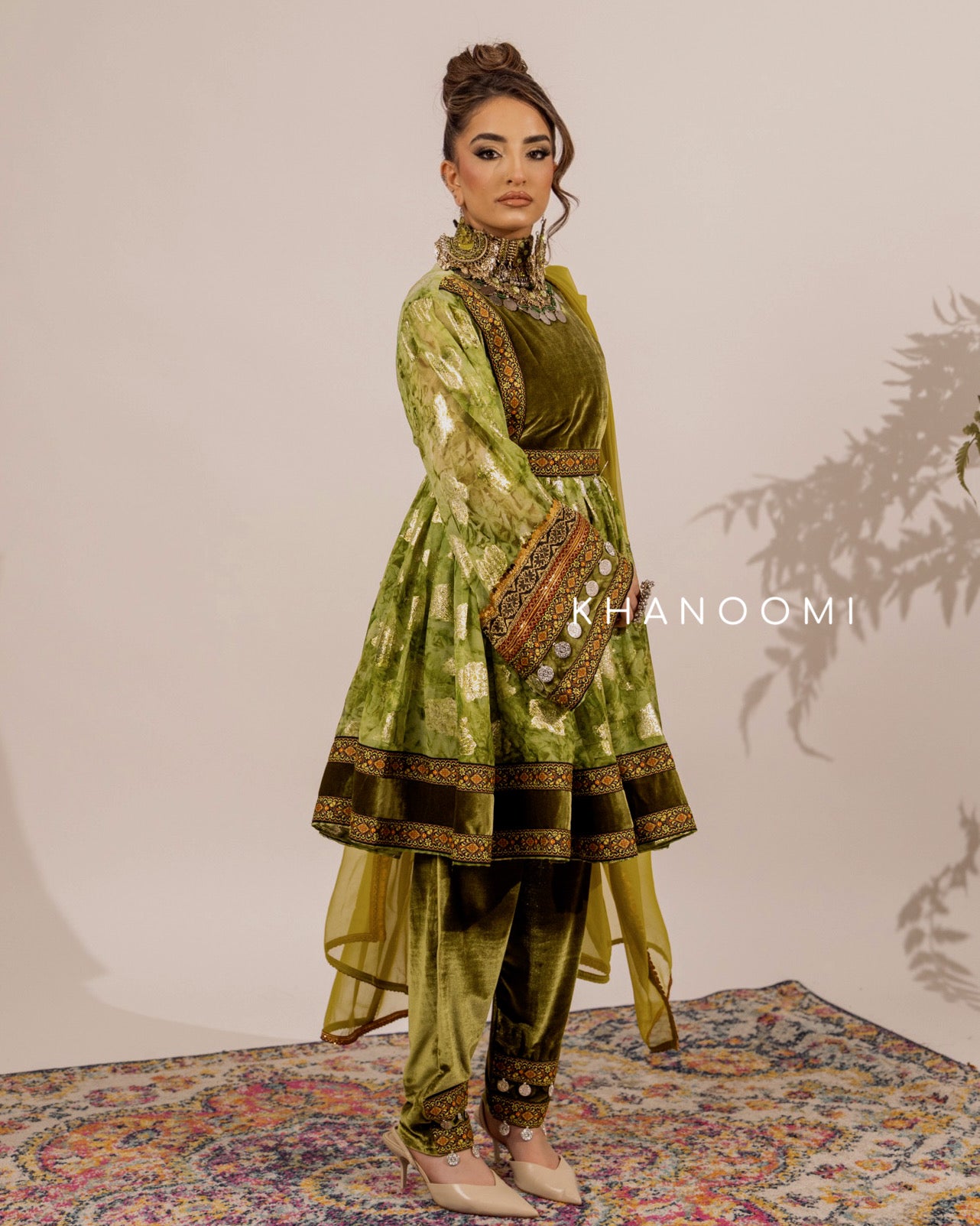 Olive Green three-piece set featuring elegant detailing and a flowing printed skirt. Designed with a back zip and adjustable belt for a refined fit.
