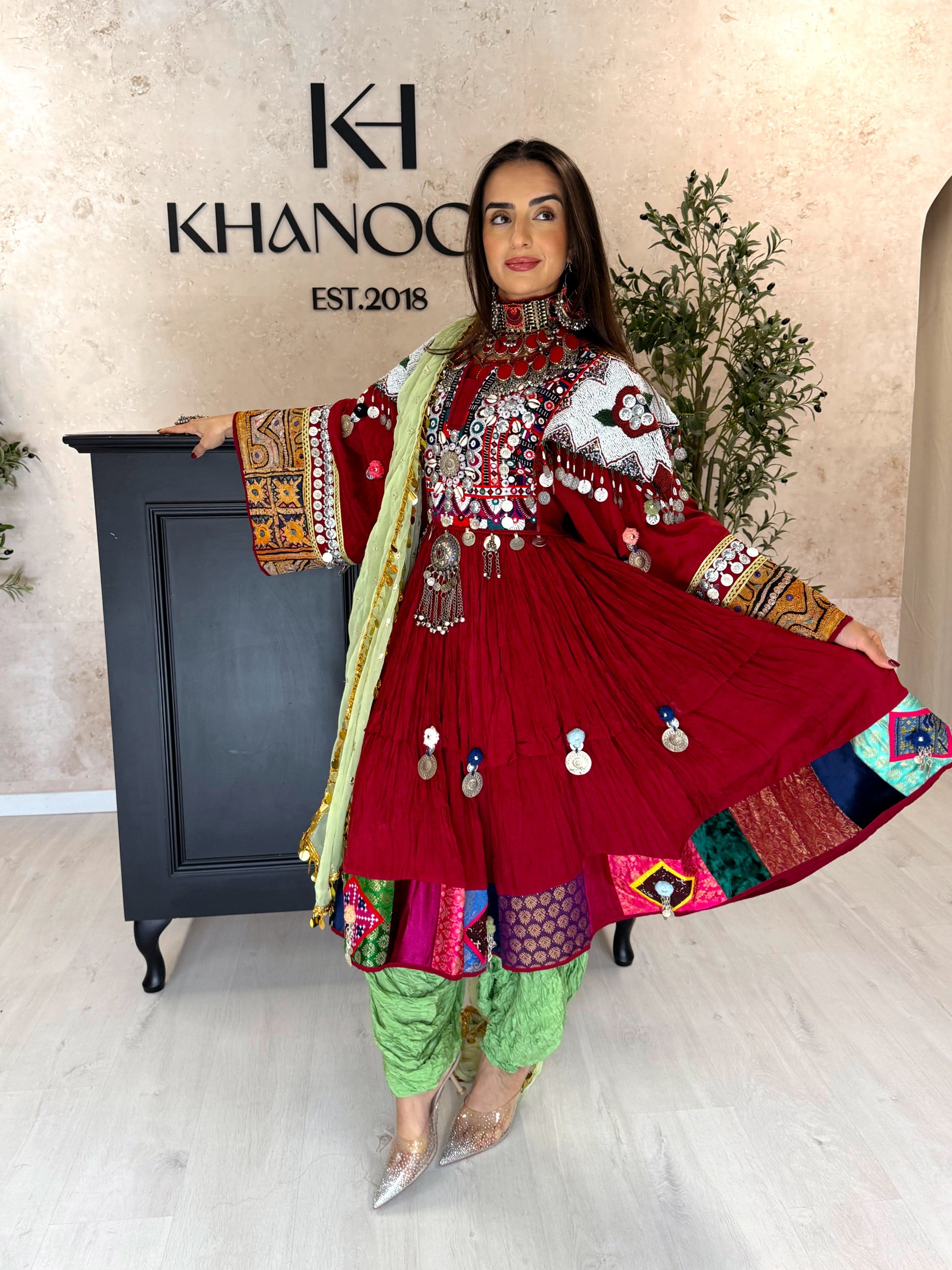 A vibrant burgundy dress complemented by a pistachio scarf and classic Kochi trousers.