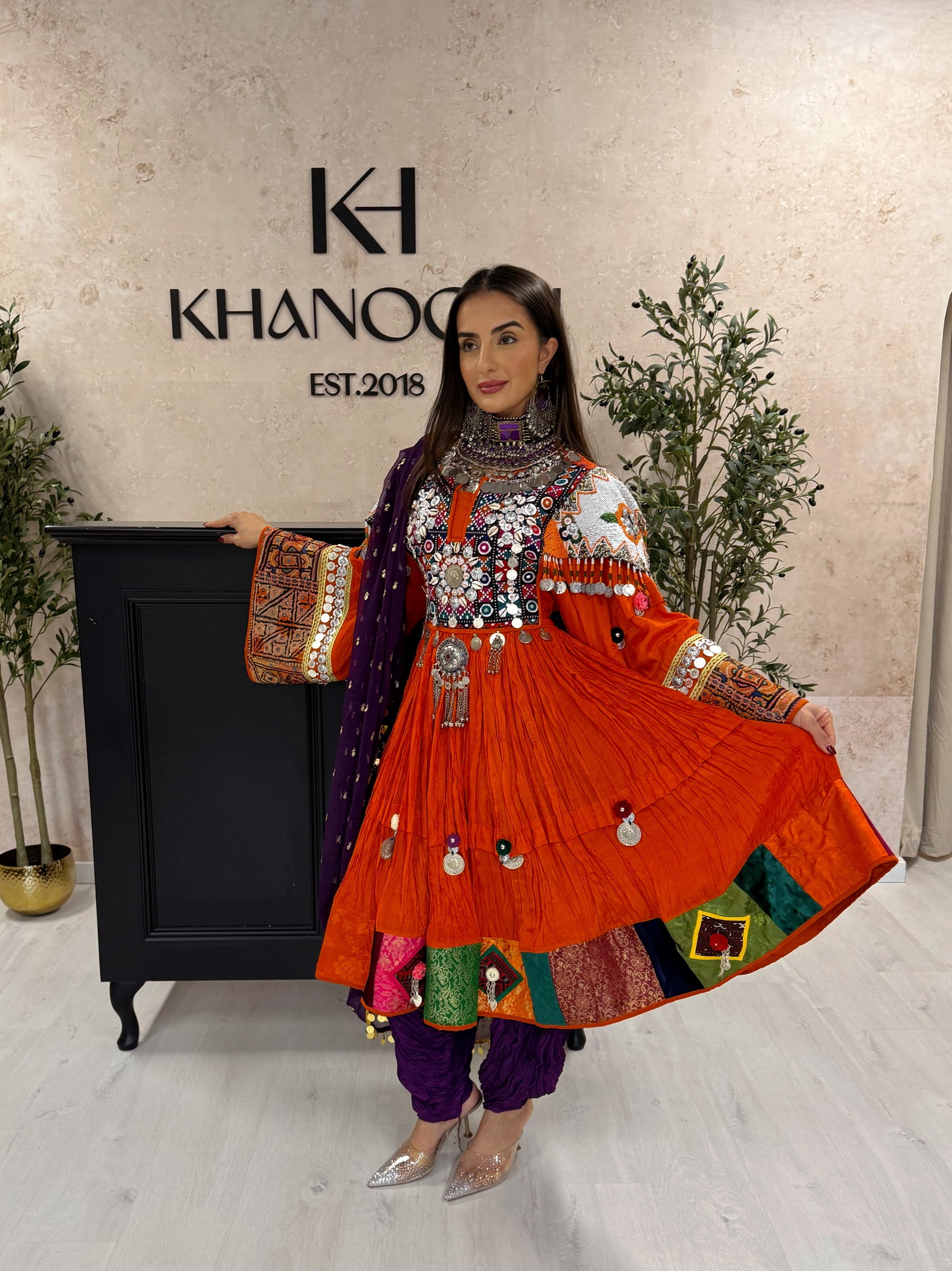 A vibrant orange dress complemented by a purple scarf and classic Kochi trousers.
